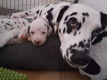 Tosca ist Stammhündin meiner Zucht, sie kam im Jahr 2013 im Alter von 9 Wochen zu mir und lebte zu der Zeit mit meiner ersten Dalmatiner Hündin "Jabaliena von Schloß Thiergarten" und meinem Rüden "Ringo vom Hügel" zusammen.